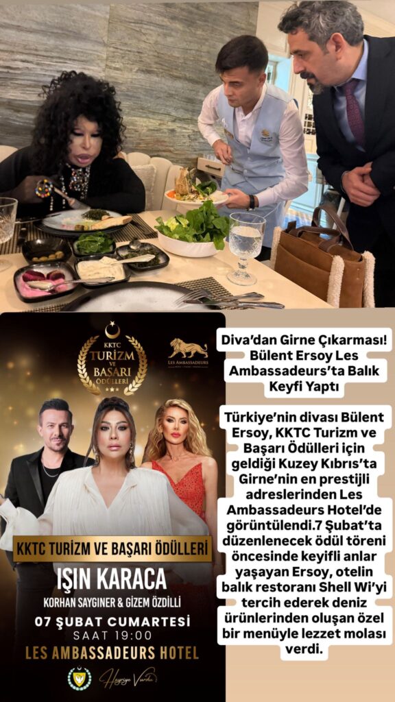 Türkiye’nin divası Bülent Ersoy, KKTC Turizm ve Başarı Ödülleri için geldiği Kuzey Kıbrıs’ta Girne’nin en prestijli adreslerinden Les Ambassadeurs Hotel’de görüntülendi.